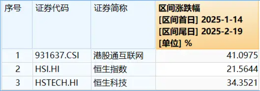 阿里巴巴是本轮港股科网牛领涨龙头之一,截至2月19日,阿里巴巴-W自1月14日以来累计涨幅已达58.9%。板块整体表现看,港股互联网ETF(513770)跟踪的中证港股通互联网指数同期累计涨幅达41.1%,较恒生科技指数、恒生指数分别超额6.75和19.54个百分点。